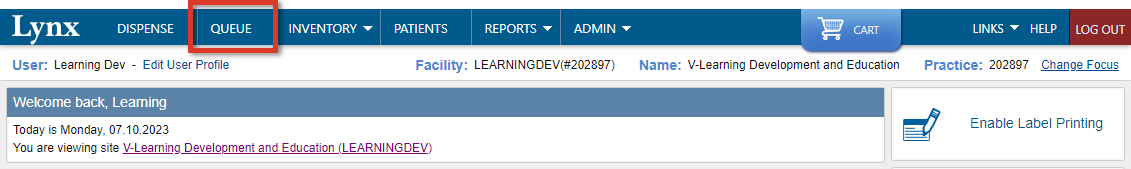 For practices that use EHR orders to queue items to be dispensed for a future date of service, it is recommended to review the Dispense transactions in the Queue before they are dispensed to confirm the EHR orders have not changed since each item was queued.