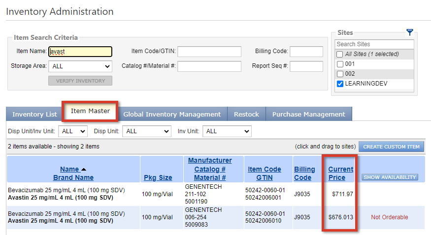 By default the Item Master tab displays items with a Current Price in Lynx.