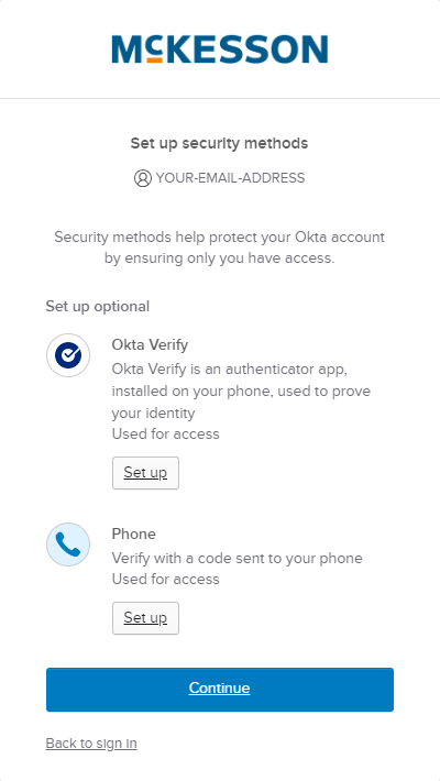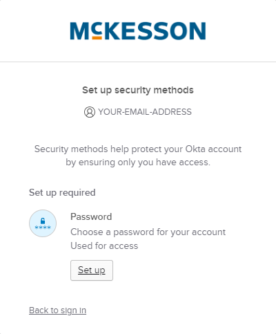 In the email, click Activate Okta Account. This link opens the Set up security methods in a new browser window.