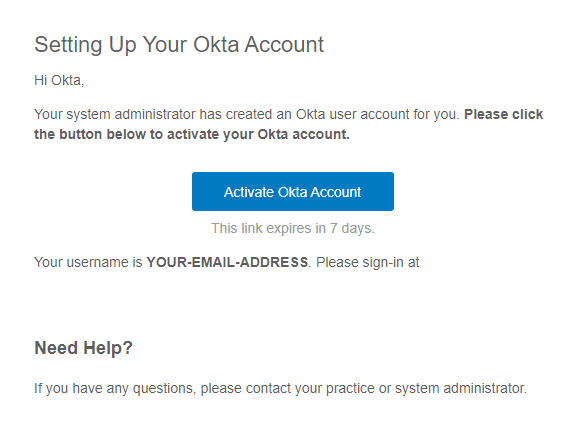 Okta is a secure way to verify your identity, which protects your patients and you. Okta uses security methods to make sure the person logging in with your Username is really you. These security methods include entering a Validation Code sent to your phone, clicking a Magic Link in an email from Okta, or using the Okta Verify mobile app.