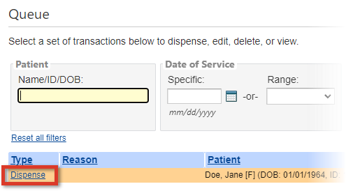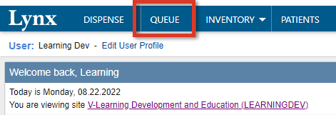 Once a dispense has been queued (i.e., you have selected a patient and added the items to be given), the dispensing process is completed from the Queue.