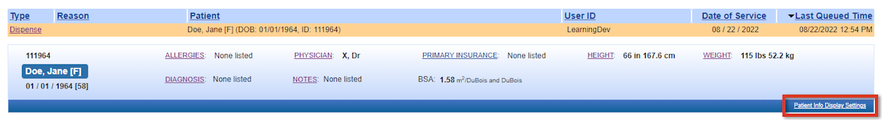 When a Dispense transaction is selected, information from the Lynx patient record is displayed in the patient header and can be used for verification purposes.