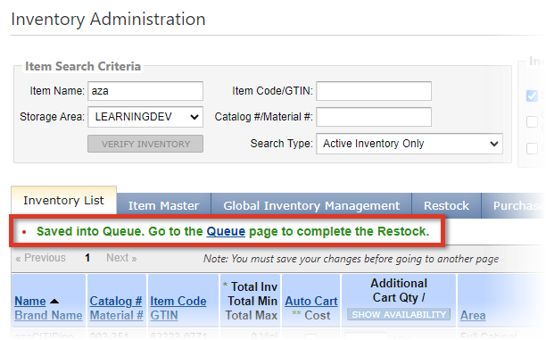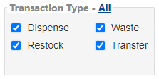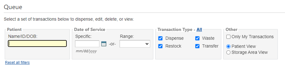 All Dispense, Restock, Return, Transfer, and Waste transactions are completed from the Queue, as these transactions require access to a Storage Area to add or remove inventory.