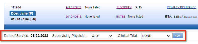 Confirm the Date of Service and Supervising Physician selections are appropriate and whether the treatment is part of a Clinical Trial.