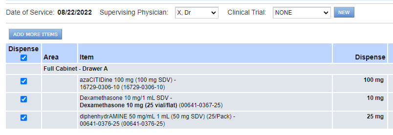 Use the checkboxes in the Dispense column to choose which items to dispense.